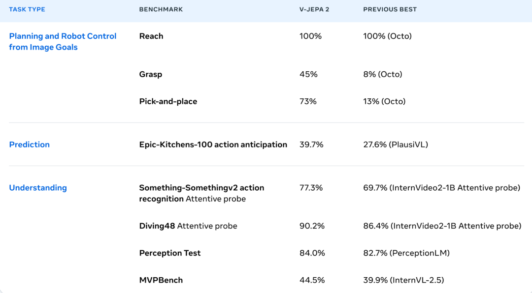 就在刚刚,Meta 又有新的动作,推出基于视频训练的世界模型 V-JEPA 2(全称 Video Joint Embedding Predictive Architecture 2)。其能够实现最先进的环境理解与预测能力,并在新环境中完成零样本规划与机器人控制。