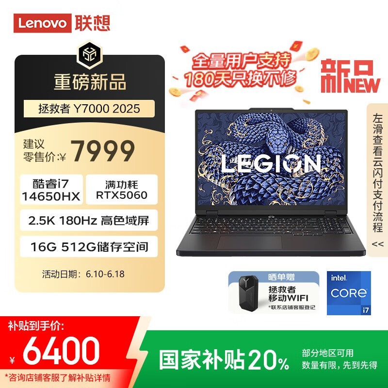 联想拯救者Y7000 2025款游戏本限时特惠6199元