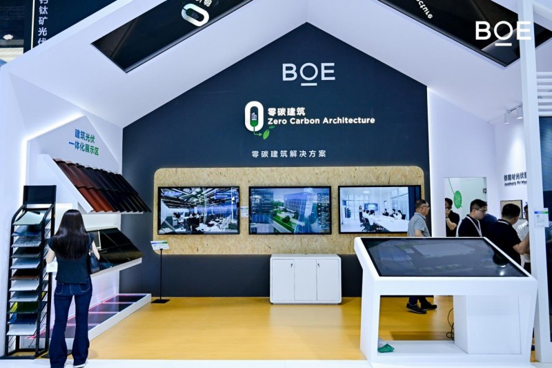 在零碳建筑展区内,BOE(京东方)展出首发的钙钛矿全场景BIPV(建筑光伏一体化)产品及解决方案,通过钙钛矿优异的发电性能,结合独特外玻处理技术,打造了模拟建材纹理的光伏艺术墙;并充分利用钙钛矿的柔性、透光性,推出光伏瓦、光伏幕墙、光伏砖等全系列产品,提升了产品质感的同时还为建筑美学减碳提供可能。同时,BOE(京东方)展出的零碳建筑解决方案以楼宇为载体,通过物联网技术及AI智能算法相结合,实时采集楼栋能耗数据并进行调节,有效提升设备运行效率,降低运营碳排放量,助力实现零碳目标。