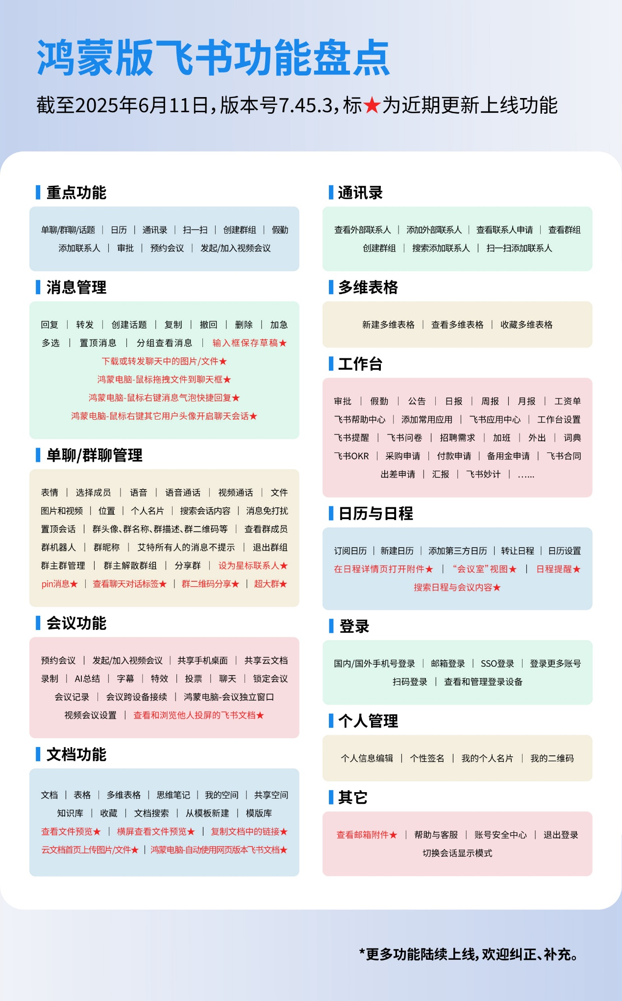 自5月19日鸿蒙电脑发布会上公布上架融合生态应用数量超1000款以来,鸿蒙电脑融合生态应用数量已突破2000+,实现翻倍增长,鸿蒙电脑生态适配进程明显提速。鸿蒙版飞书自上架以来,一直保持高频迭代,开发团队持续努力,不断将用户的“心愿单”变为现实。除上述新功能外,鸿蒙版飞书还在近期支持了收发语音和加急消息、创建和编辑日程、预约会议室、编辑邮件内容/保存邮件草稿、编辑云文档中的基础文本格式、云文档上传文件等功能。相信鸿蒙版飞书还将在手机、平板、电脑等多设备上同步快速迭代,让鸿蒙5用户的多端协同办公效率更上一层楼。
