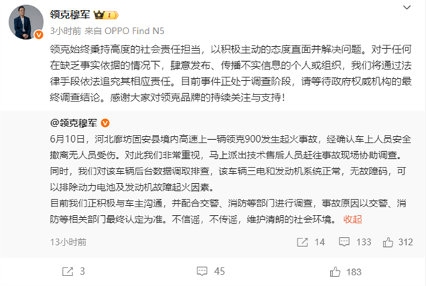 起火事故发生后,网络上流传了一些传言,今日上午,他转发这条微博强调称:领克始终秉持高度的社会责任担当,以积极主动的态度直面并解决问题。