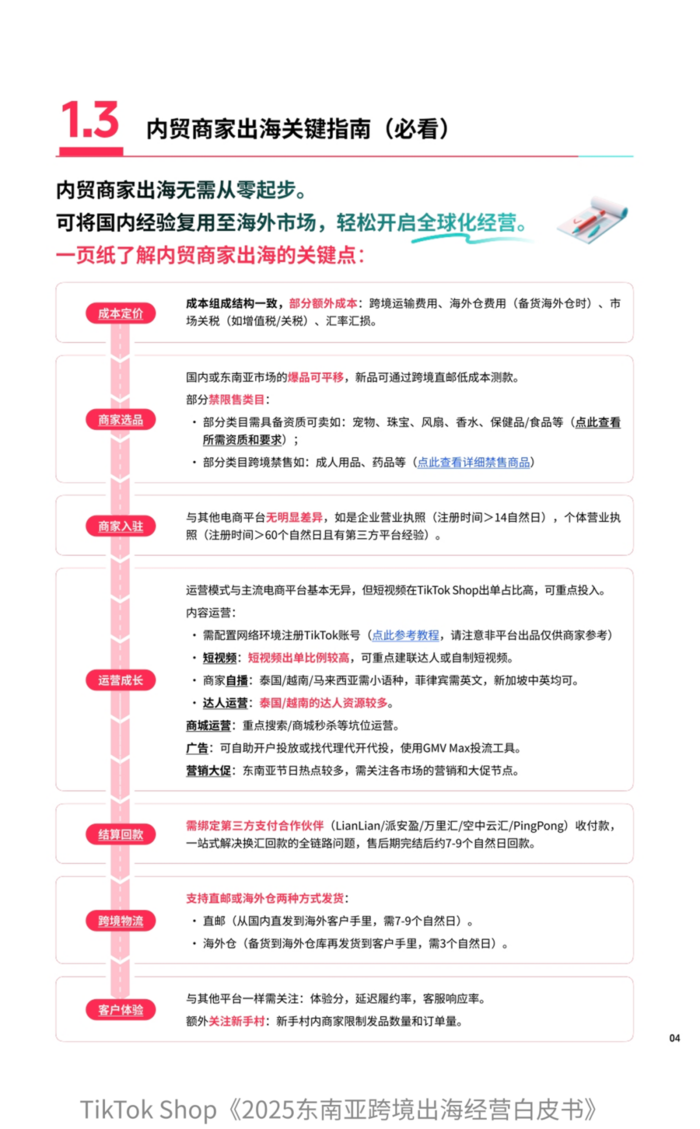 · 第一,加速国内品牌出海。TikTok Shop东南亚跨境电商推出全链路扶持政策与方法论支持,即“飞轮计划Plus”和《2025东南亚跨境出海经营白皮书》,针对内贸商家出海痛点,从简化入驻流程到提供跨境运营指导(含直播、短视频、达人合作等国内成熟经验复用),助力商家从产品出海升级为 “全球品牌”。