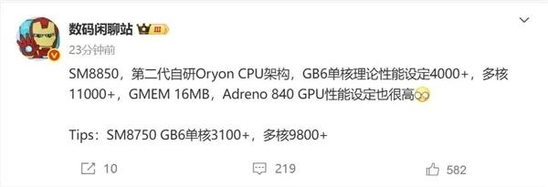 6月12日消息,博主数码闲聊站爆料,高通骁龙8 Elite 2(SM8850)采用第二代自研Oryon CPU架构,GeekBench 6单核理论性能设定在4000+,多核成绩11000+,GMEM 16MB,并集成Adreno 840 GPU。