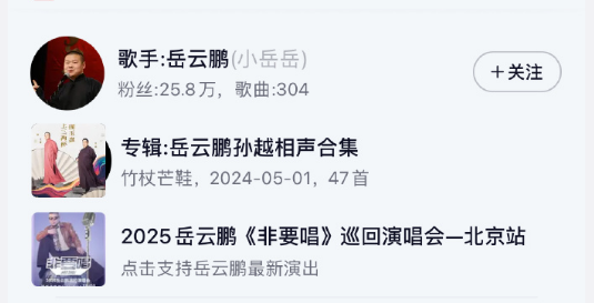 值得注意的是,在网易云音乐查询发现,岳云鹏在网易云音乐上面的认证身份是歌手,歌单除了《五环之歌》,还有《春歌》《送情郎》《往事只能回味》等歌曲。
