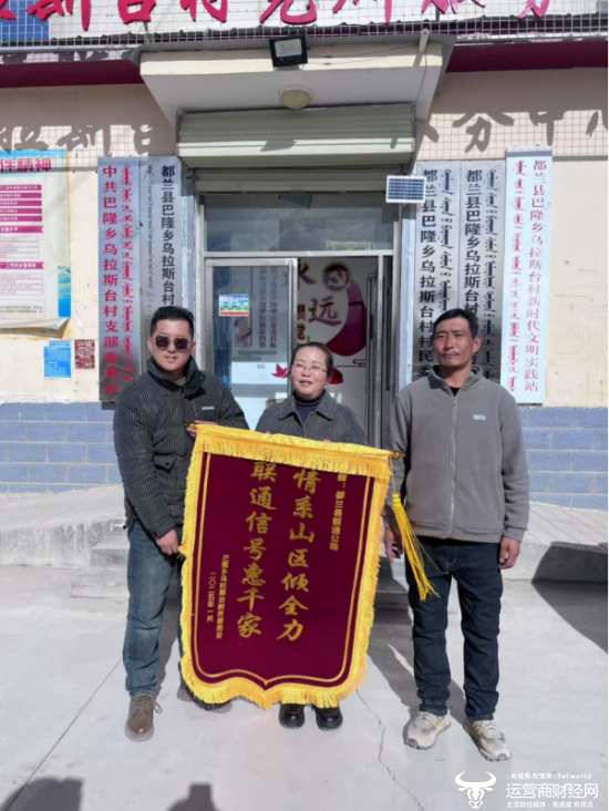 2025年2月,都兰县分公司收到了一份特别的礼物——来自都兰县巴隆乡乌拉斯台村民委员会的一面锦旗,锦旗上“情系山区倾全力,联通信号惠千家”的金色大字熠熠生辉,饱含着村民们对都兰县分公司由衷的感谢。