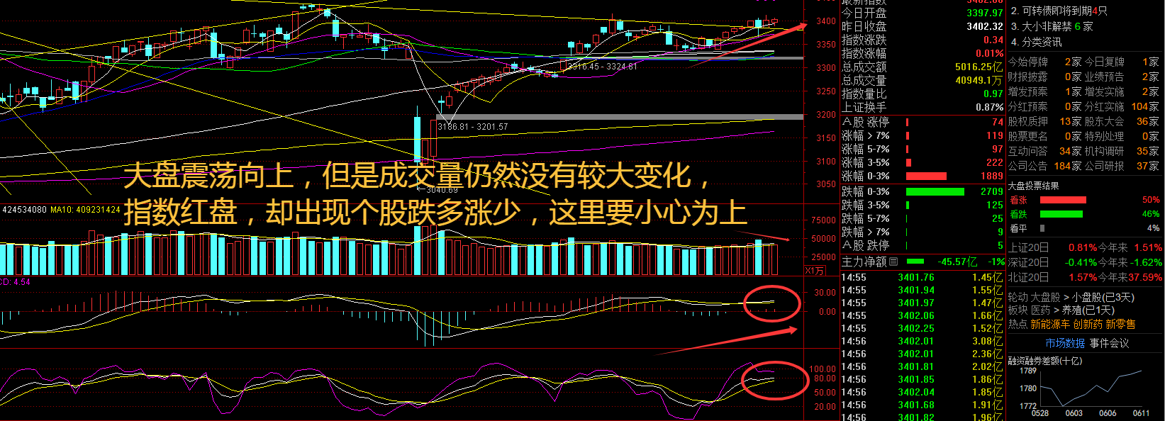 外围欧美股市继续新高,这也是牛哥之前提到的共振行情,既然全球金融市场都在涨,我们也没必要害怕!现在A股的问题还是在于“信心”,指数连前高都没到就已经有机构资金在3400点附近减仓了,近期的放量就能说明问题,这里一旦主力资金拉升指数,不排除资金回头疯抢的盘面出现。牛哥仍然记得每一次反弹的中后段都是快速而猛烈的,踏空资金疯狂进场,市场出现放量走势,当大家都还在幻想着大牛市来临之际,往往就是行情要峰回路转之时,这也说明现阶段反而可以稍微大胆一点:“亏钱你都抗住了,赚钱你怕了?”