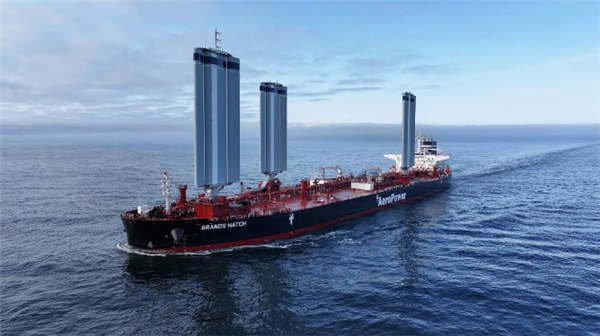 “BRANDSHATCH”轮的核心创新在于配备了三具高度超过40米的硬质翼型风帆。该风帆系统依托数字控帆技术,能根据实时气象数据智能调整帆角,并通过机械液压传动系统实现升降、开合与旋转,为船舶提供额外推力。这不仅显著降低主机燃油消耗和碳排放,更有效提升了船舶运营效能。