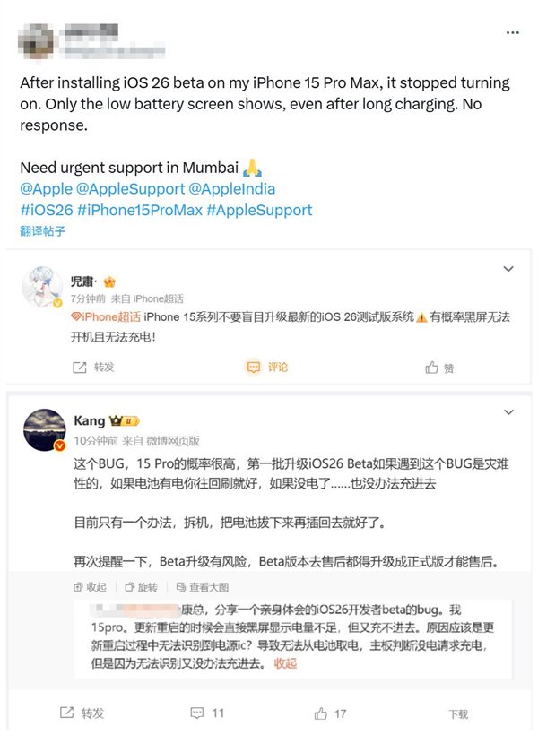 部分用户在社交平台上反馈,iPhone 15系列升级iOS 26之后出现黑屏且无法充电的情况。