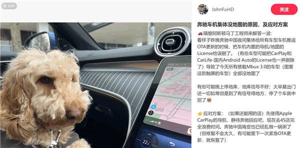 此外,一位自称是阿斯顿马丁工程师的网友“@ JohnFuHD”发帖表示,故障原因可能是昨晚奔驰中国夜间集体给所有车型车机推送OTA更新的时候,把车机内置的导航/地图的License给误删了。