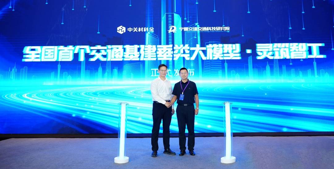 国内首个交通基建垂类大模型“灵筑”正式发布(左:中关村科金总裁喻友平,右:宁夏交建研究院院长惠迎新)