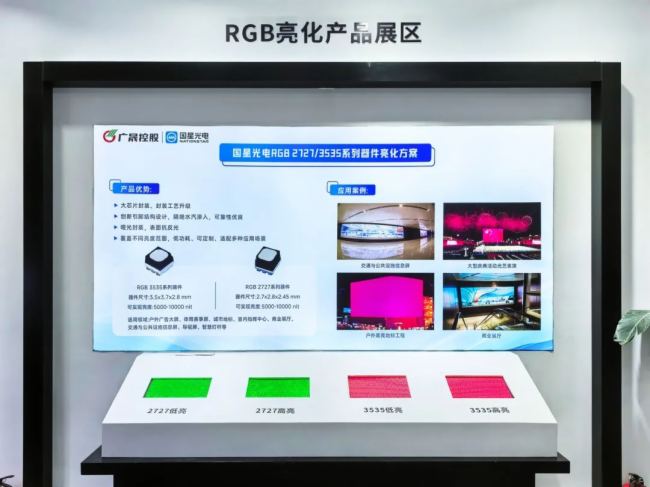 在RGB亮化产品区域,2727和3535系列凭借高亮度、高可靠性、低功耗性能成为焦点。两大系列产品提供丰富的亮度参数选项,支持客户个性化定制,适配固装工程、文旅亮化、租赁显示等多元场景。其稳定的产品性能与成熟的行业解决案例,进一步巩固了国星光电在LED亮化市场的领先地位,吸引现场众多客户洽谈合作。