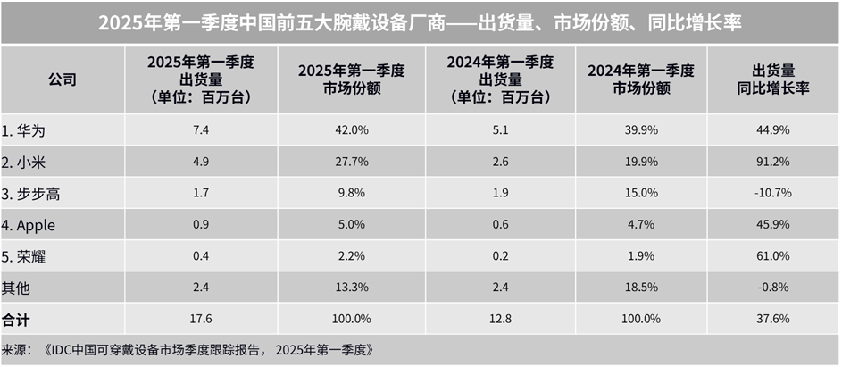 2025年第一季度华为在全球腕戴市场上跃升到第一位。同时,在中国腕戴市场保持显著增长态势,并稳居出货量第一。鸿蒙生态协同效应逐渐释放,跨设备互联能力强化了其智能腕戴设备的生态粘性。今年第一季度,华为手环新品Band 10上市,并在全球范围内广泛出货,进一步拉动华为腕戴产品整体出货规模。新款FIT系列手表和接下来即将升级的WATCH系列也将进一步推动其向中高端市场迈进。