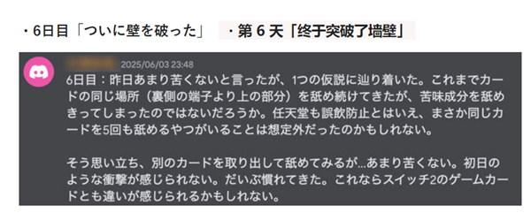 第六天,编辑怀疑自己是否已经舔掉了卡带表面的苦味剂,于是又拿了一张新的卡带尝试,结果发现苦味依然存在,自己只是逐渐适应了这种味道。