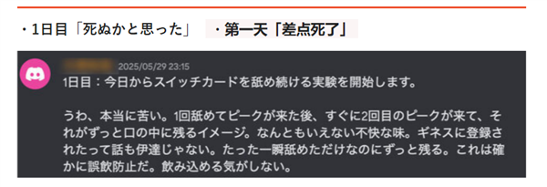 第一天,编辑舔了一下卡带,发现苦味非常强烈,即使只是短暂接触,苦味也会在嘴里久久不散,编辑形容为“差点死了”。