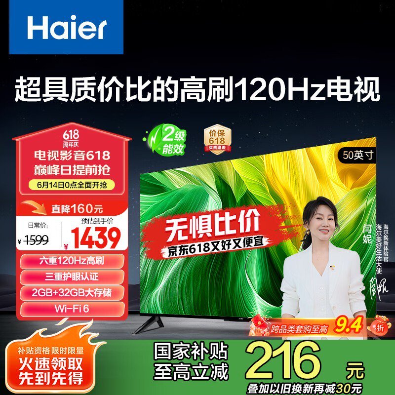 海尔50H5电视120Hz高刷4K超清屏护眼大屏限时特惠价1223元