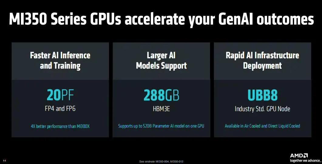 新的 GPU 基于 AMD CDNA 4 架构,3nm 制程工艺打造,集成了 1850 亿个晶体管,支持 FP4 & FP6 新一代 AI 数据类型,可提供 288GB HBM3E 显存,支持单 GPU 上运行高达 520B 参数的 AI 模型,支持 UBB8 行业标准 GPU 节点,提供风冷和直液冷两种版本,可以帮助企业实现快速部署基础设施。