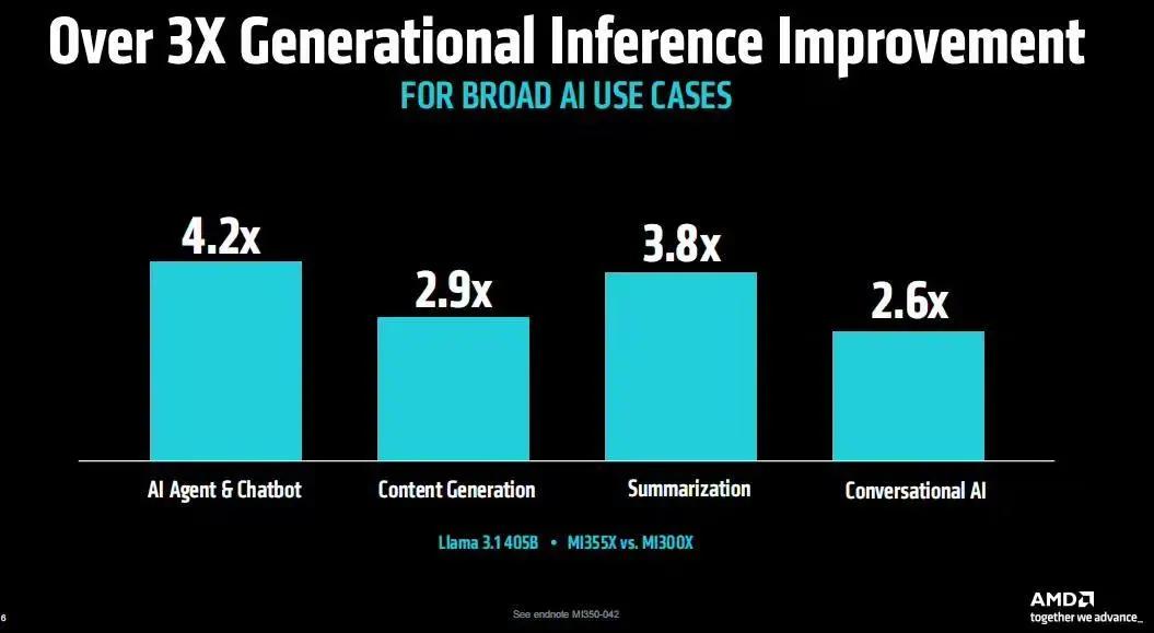 而在和上一代 MI300X 的对比中,MI355X 运行 Llama 3.1 405B 模型,在 AI 智能体性能表现上是前者的 4.2 倍,内容生成能力是上一代 MI300X 的 2.9 倍,摘要能力是上一代的 3.8 倍,对话式人工智能表现则为 2.6 倍。