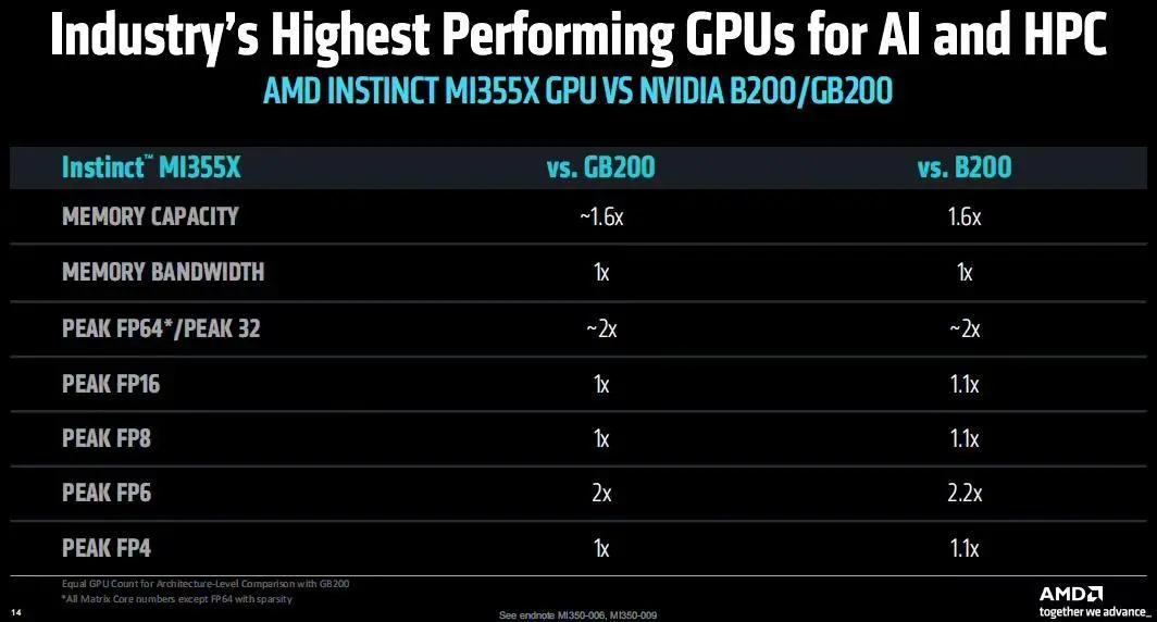 在 FP4 运算上,MI355X 与竞品的峰值性能相近,小幅领先。