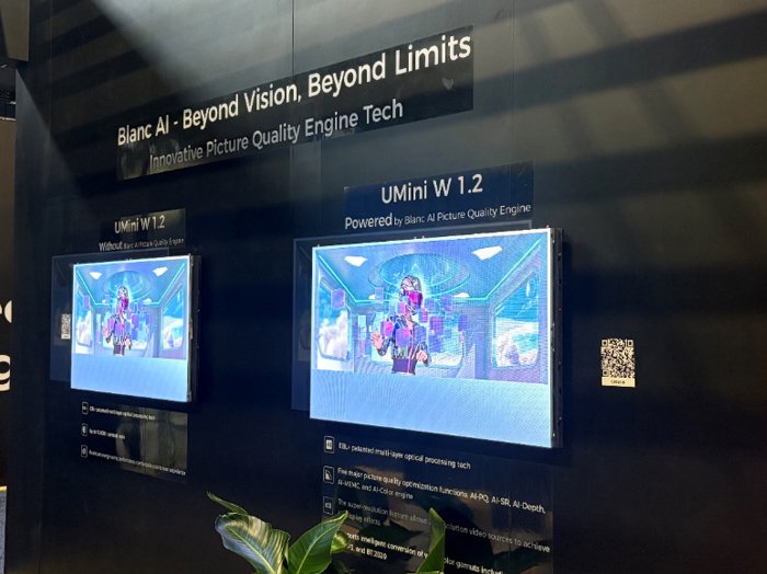 在Mini/Micro LED产品方面,洲明本次展出了热销旗舰UMini W1.2。产品搭载洲明自研的Blanc AI 勃朗峰画质引擎技术,视觉效果对比其他同规格Mini LED有了质的飞跃,Uni-SR 2.0、Uni-MEMC、Uni-CE、Uni-PQ、Uni-Depth 5大画质引,在清晰度、画面细节、动态表现、色彩细节、景深立体感等多个维度全面提升视觉效果,控制系统结合图像算法,以卓越画质为光显赋能,重新定义高端LED显示屏的画质极限。