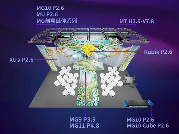 新亚胜展出Xtra P2.6灵活弧形应用方案、Rubik P2.6立方体应用方案、MG10 P2.6/MG10 cube P2.6/MU P2.6户内租赁屏、MG9 P3.9户内外租赁屏、MT H3.9-V7.8租赁通透屏、MG11/MG12/MG13/MG14/ MG15创意显示屏等产品矩阵。