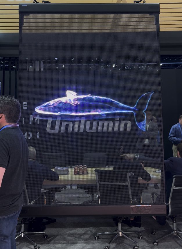 除此之外,Udesign SV 商显全息透明屏也吸引了现场的用户的关注,该方案解决了"视觉通透性与数字展示效果不可兼得"的行业难题。其革命性的95%透光率成就核心优势:息屏时如"空气隐形"般隐匿于玻璃后方,毫不影响橱窗陈列与自然采光;点亮瞬间则迸发出令人惊叹的高亮度近3D全息影像效果。