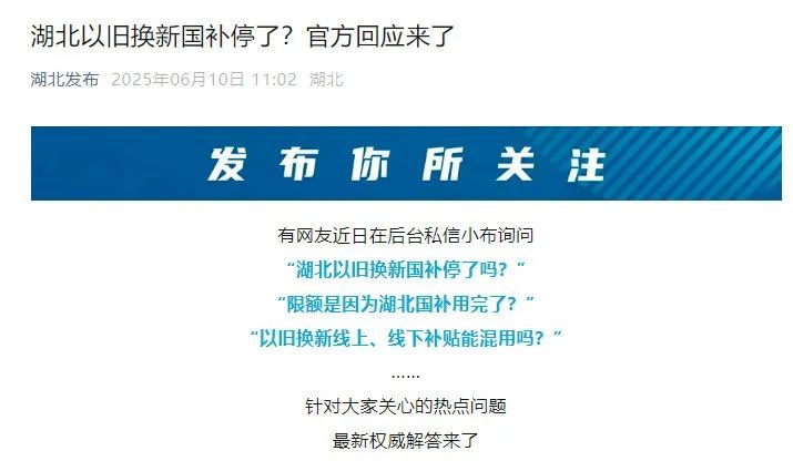 6月10日,湖北也针对以旧换新“国补”发布最新部署。“湖北发布”微信公众号发布解答信息称,湖北“国补”将持续至12月31日。同时,湖北对“国补”规则进行调整,采取每日限量发放,先到先得的方式,资格券区分线上、线下渠道。6月10日后领取的补贴券有效期为7天,过期作废。湖北进行限额管理的主要目的,是为了让更多消费者享受到“国补”政策福利。