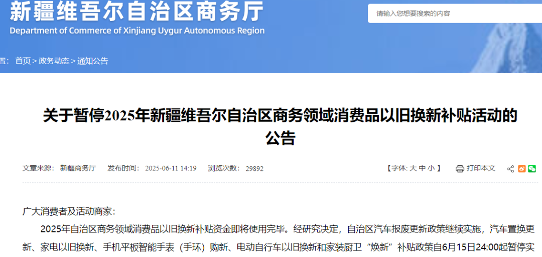 6月11日,新疆维吾尔自治区商务厅发布公告称,2025年自治区商务领域消费品以旧换新补贴资金即将使用完毕。经研究决定,自治区汽车报废更新政策继续实施,汽车置换更新、家电以旧换新、手机平板智能手表(手环)购新、电动自行车以旧换新和家装厨卫“焕新”补贴政策自6月15日24:00起暂停实施。后续活动开展时间另行通知。