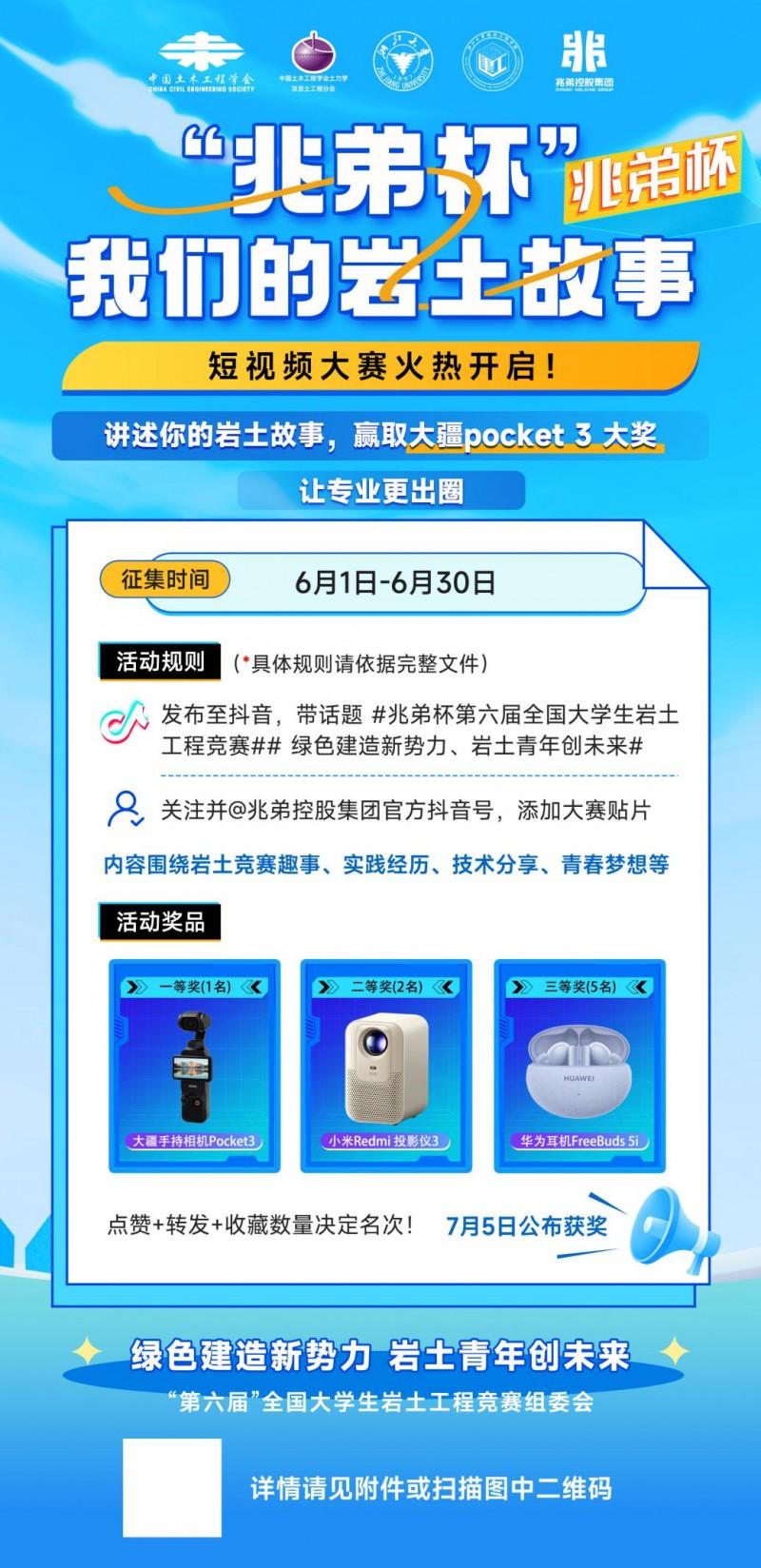 为展现当代岩土学子的多元风采,组委会已于近期启动配套活动——“兆弟杯·我们的岩土故事”抖音短视频大赛,由独家冠名支持单位兆弟控股集团提供包括大疆Pocket3等在内的丰厚奖品。