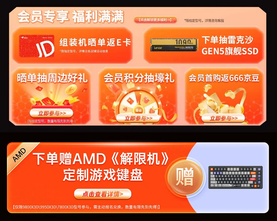 为了让大家可以享受到全部AMD京东618大促福利,建议一定要成为AMD京东自营旗舰店的会员,加入会员可以抽取周边好礼,会员首购就返666京豆,累积的积分还能再抽壕礼。活动期间所有用户下单组装机产品可以领取每满999-30的优惠券,还可以参与评价晒单返京东E卡;下单还能抽雷克沙GEN5旗舰SSD,参与《解限机》游戏键盘兑换活动,活动礼品数量有限,先到先得。(每项活动都限指定型号,请朋友们看清楚下单规则,更多详细活动信息请以页面显示为准)。