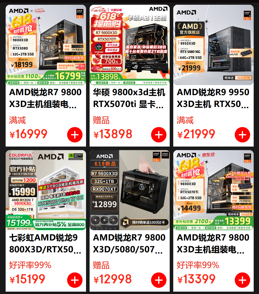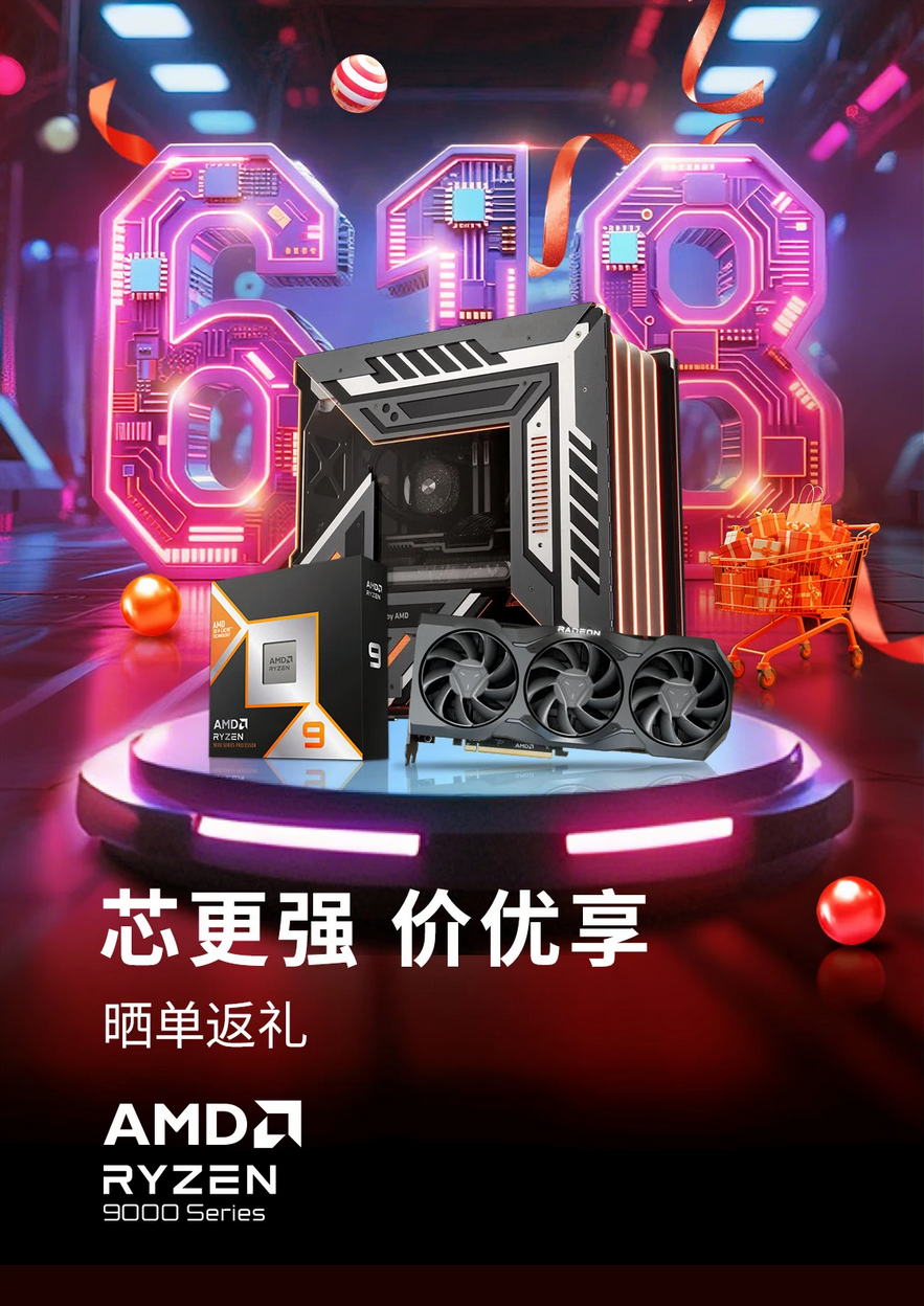 AMD京东自营旗舰店618高潮期大促依然包含了全线DIY产品,不仅有全新的锐龙9000/9000X3D系列处理器,还有依旧热销的锐龙7000/7000X3D系列处理器和经典的锐龙5000系列处理器,同时还有和主板合作伙伴推出的板U套装超值搭配,让朋友们搭建自己全新的整机平台更加方便快捷。当然AMD还为不熟悉DIY攒机的用户们准备了多款整机产品,这些由各大装机品牌商使用锐龙处理器和Radeon显卡打造的整机产品不仅性能强劲,还都拥有极具品牌特色的外观,这些内外兼修的整机一定有一款可以满足大家的需要。