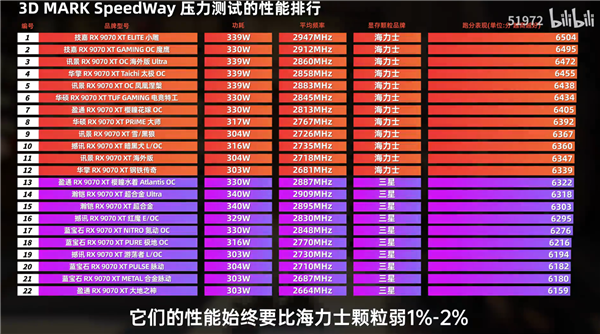 在其最新发布的涵盖22款RX 9070 XT显卡的评测视频中,这一现象也得到了验证。在3D Mark SpeedWay压力测试中,排名相对靠后的几款产品均采用了三星显存颗粒。