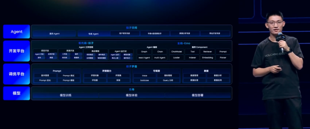 其中智能体 IDE 方便开发者高效地开发、调试 Chatbot 类的 Agent,还提供上千个插件供开发者使用,支持搭建工作流并利用基于火山引擎搭建的知识库;同时基于火山方舟平台,支持了业界大多数模型;打通主流发布渠道,尤其是 C 端,比如豆包、飞书、微信、抖音、小程序等渠道,让用户更方便地使用基于扣子搭建出的 Agent。