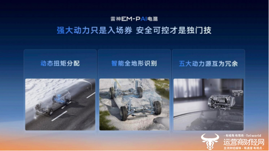 此外,雷神EM-P AI电混采用5动力源冗余设计(P1、P3、发动机、后轮双电机互为冗余),并以动态扭矩分配方案,结合星睿AI云动力2.0的智能全地形识别功能,动态分配四轮扭矩,防止车轮打滑、快速抑制横摆,甚至可以做到全场景爆胎稳定控制,让每一份动力都精准分配在安全与性能的黄金分割点上,是“最安全的四驱电混”。