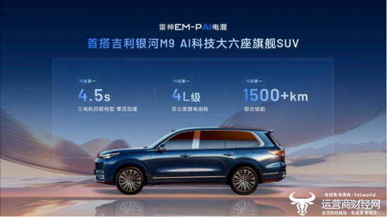 率先搭载雷神EM-P AI电混的吉利银河M9,匹配独立三电机,0-100km/h加速时间仅为4.5s,同级第一;百公里馈电油耗仅为4L级,综合续航里程超过1500km,同样同级第一。