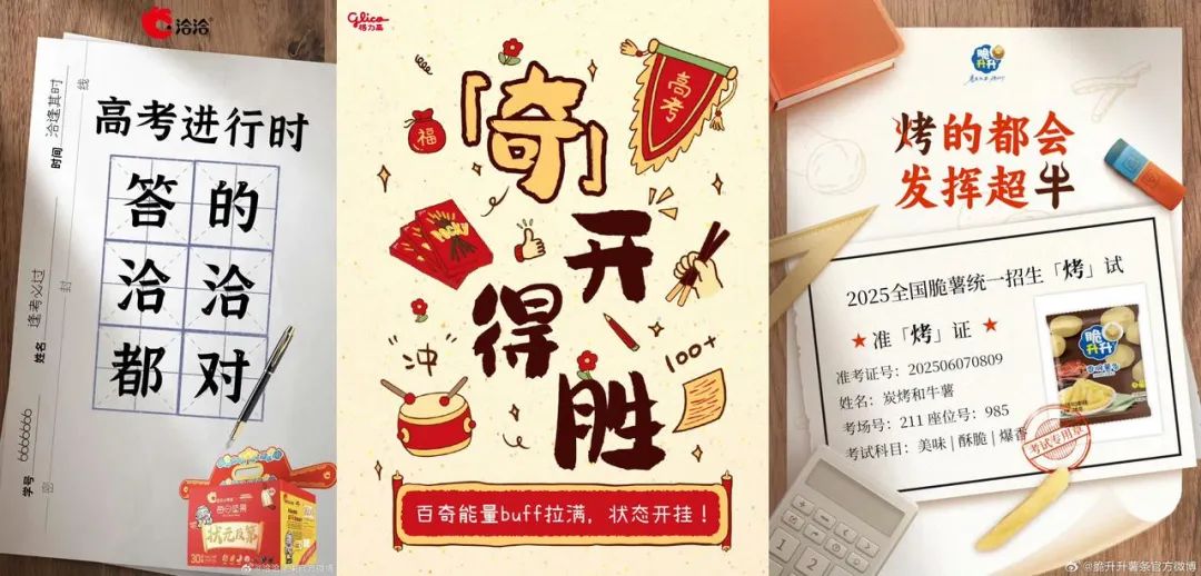 格力高旗下的百奇喊出“奇开得胜”的口号,脆升升借自家炭烤和牛味薯条给出了更丰富的祝福——“烤的都会,发挥超牛”,洽洽不仅在考试期间连续三天输出谐音祝愿,还和东鹏特饮、王老吉组合发力,成为了高考季谐音梗输出数量最多的品牌。