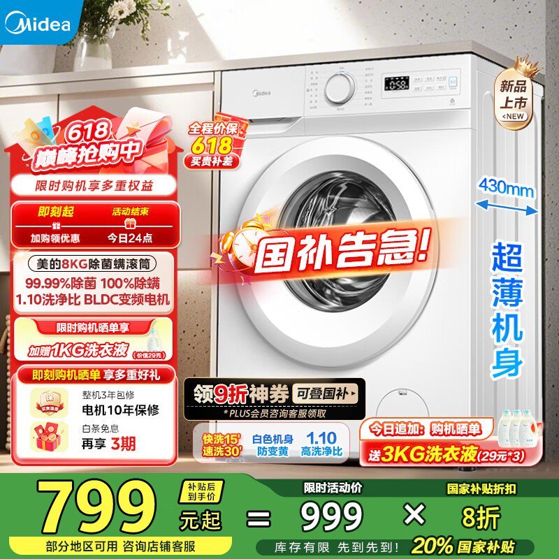 美的滚筒洗衣机守护系列直降282元