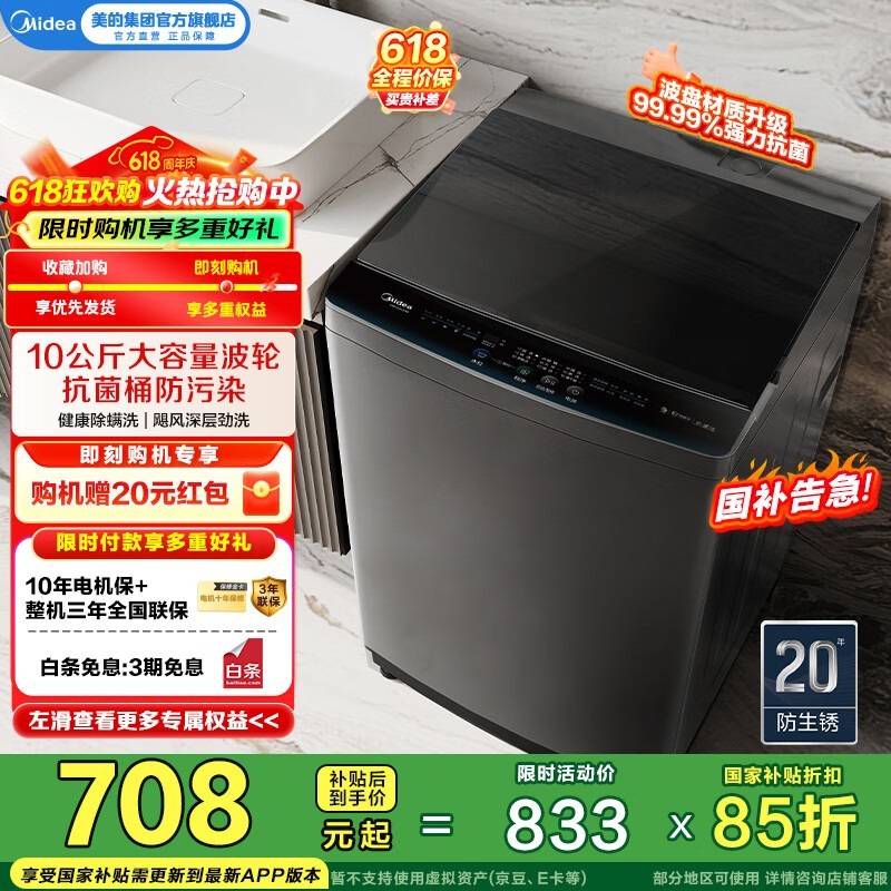 美的波轮洗衣机MB100V33B京东优惠价708元