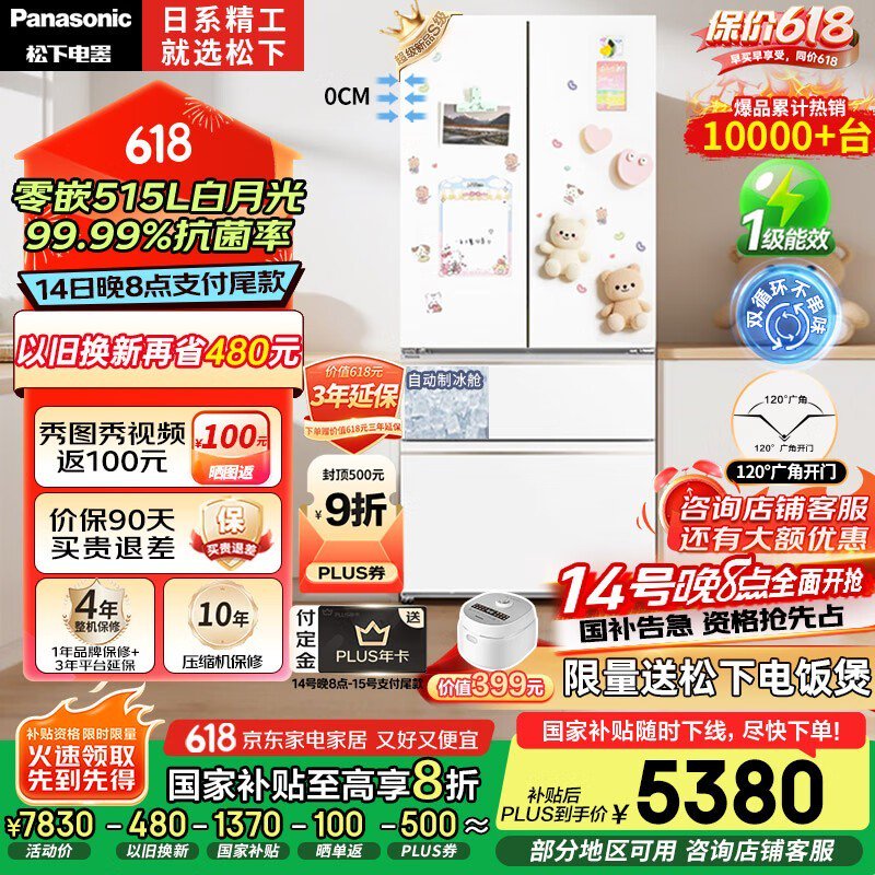 松下大海豹2.0冰箱515升白月光NR-ED52APA-W京东活动价3950