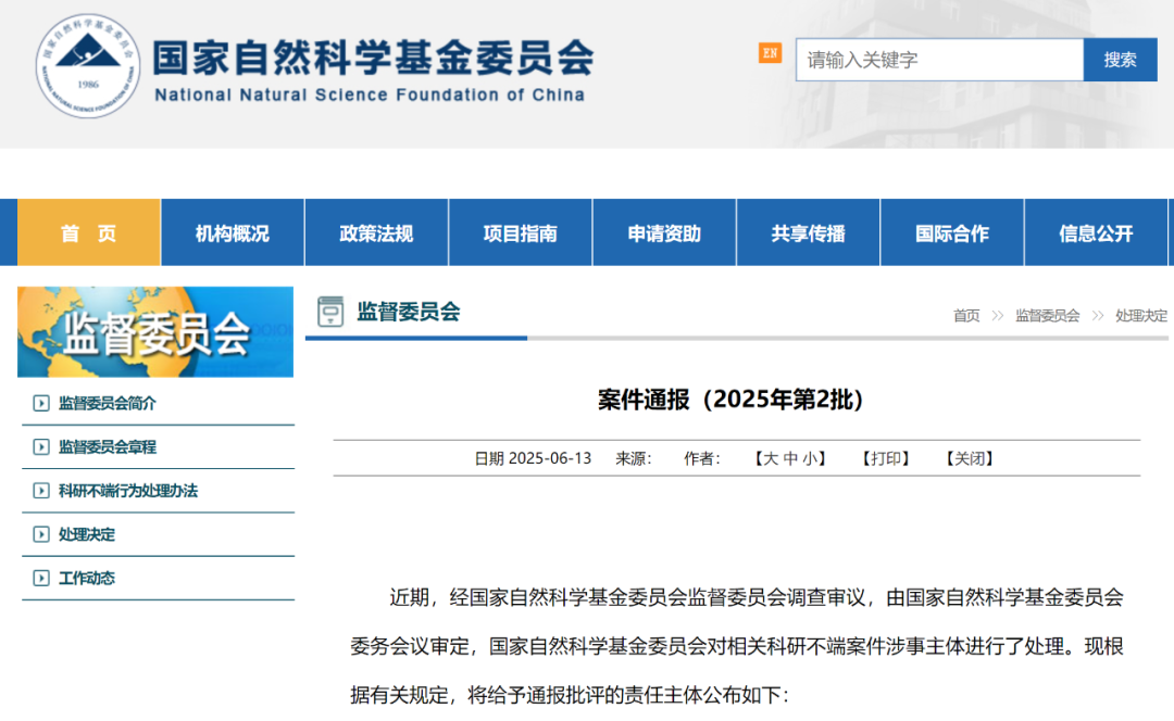 近期,经国家自然科学基金委员会监督委员会调查审议,由国家自然科学基金委员会委务会议审定,国家自然科学基金委员会对相关科研不端案件涉事主体进行了处理。现根据有关规定,将给予通报批评的责任主体公布如下: