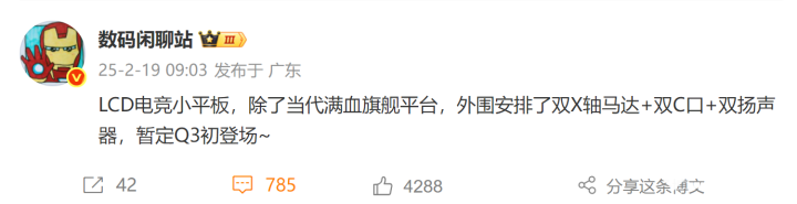 根据此前@数码闲聊站爆料称Redmi的LCD小平板侧重电竞体验。其采用8.8英寸定制高刷LCD屏,搭载天玑9400+处理器,采用一体化金属机身。平板采用了双X轴马达+双C口+双扬声器的配置。