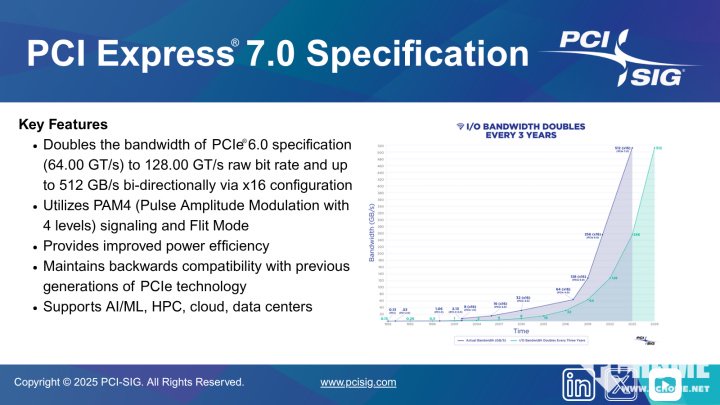 PCI-SIG正式向会员发布PCI Express (PCIe) 7.0规范,新规范的速度达到128.0 GT/s,面向数据驱动型应用。