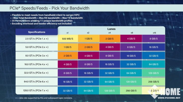 将数据传输速率提高到128 GT/s,相比PCIe 6.0规范提高了一倍,16通道可以提供高达512 GB/s的最大双向带宽。