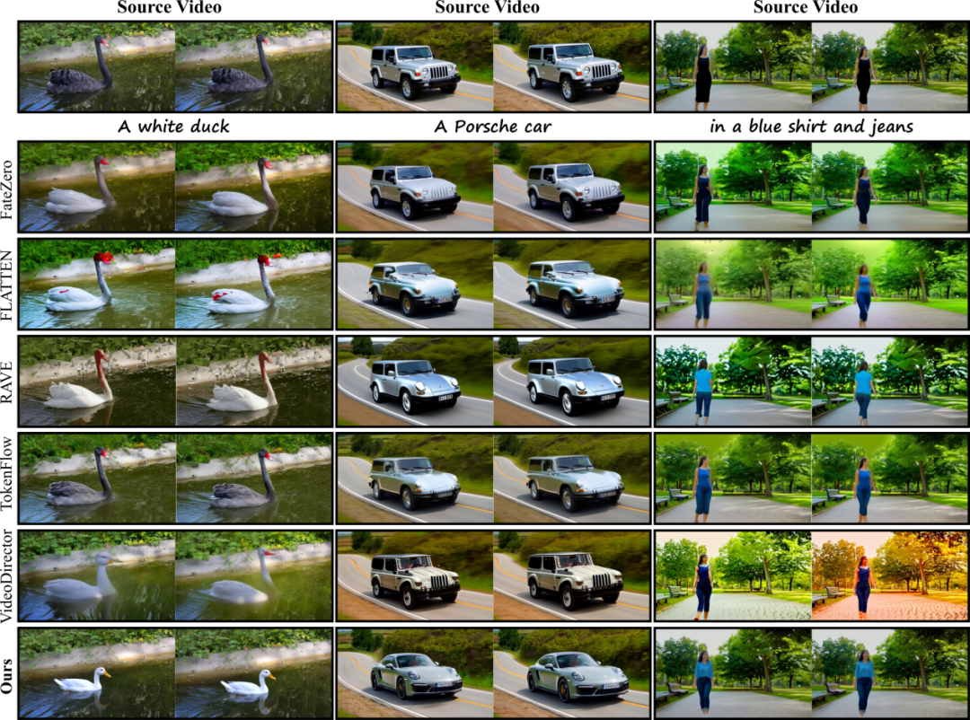 对比多种 SOTA 的视频编辑方法(如 FateZero、TokenFlow、VideoDirector 等),FlowDirector 在对象形变幅度、文本一致性、视觉细节与运动流畅度方面均表现突出,综合主观与客观评测指标均居领先水平。