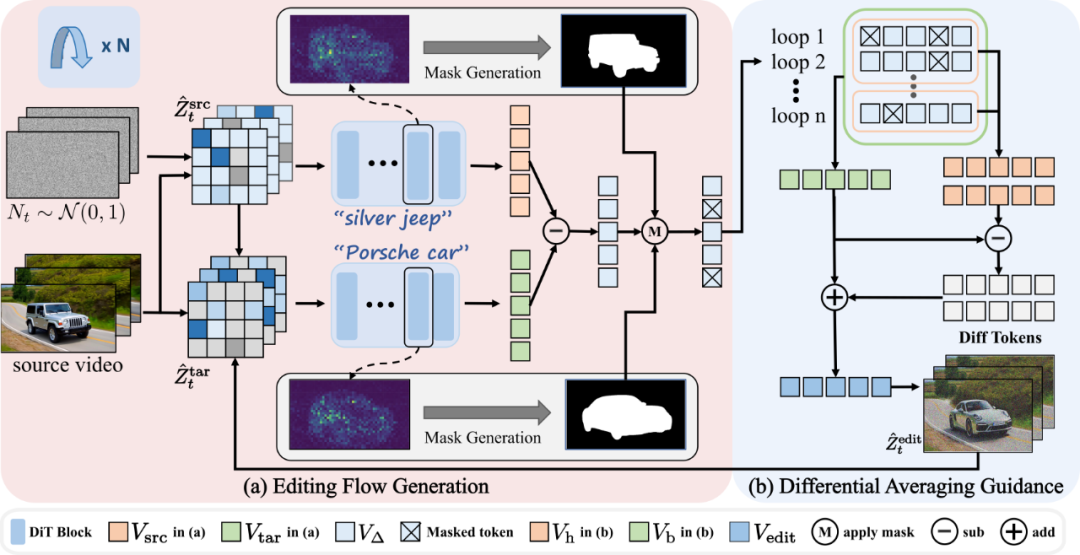 在无反演直接编辑的场景中,原始视频往往会对最终效果施加过强的 “控制信号”,导致修改后的视频中依然残留明显的原始物体轮廓或细节伪影。为此,作者团队提出了差分平均引导 (Differential Averaging Guidance, DAG),同时进行 “高质量采样” 和 “快速基线采样”,通过比对两者之间的差异来提炼出真正需要的编辑优化方向。