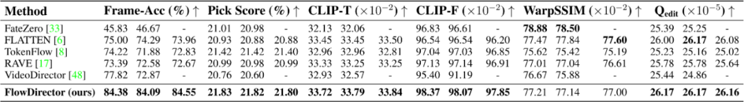 在定量结果中,FlowDirector 在各种指标上均取得 SOTA(在 WarpSSIM 上并非最高,因为 FlowDirector 能够实现更大程度的语义变换,导致像素级的光流扭曲数值略低),超过了已有的视频编辑方法。