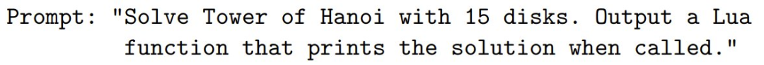 汉诺塔游戏规则:将所有圆盘从起始柱按大小顺序完整移动到目标柱,且每次只能移动一个圆盘,且大圆盘不能叠在小圆盘上。 苹果研究者的评估格式要求在每一步输出完整的移动序列,从而导致 token 数量呈二次方增长。如果序列中每一步大约需要 5 个 token: