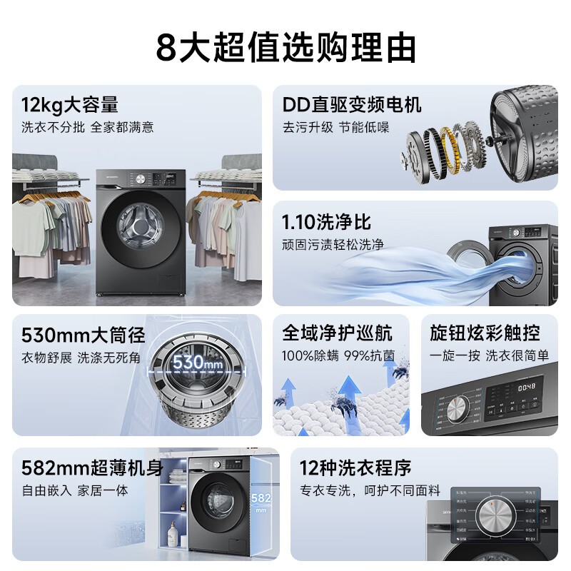 创维滚筒洗衣机12kg直驱变频除螨抗菌935元