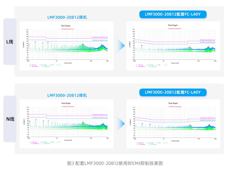 ①LMF3000-20B12配套FC-L40Y测试能满足Class B,余量有13dB以上。
