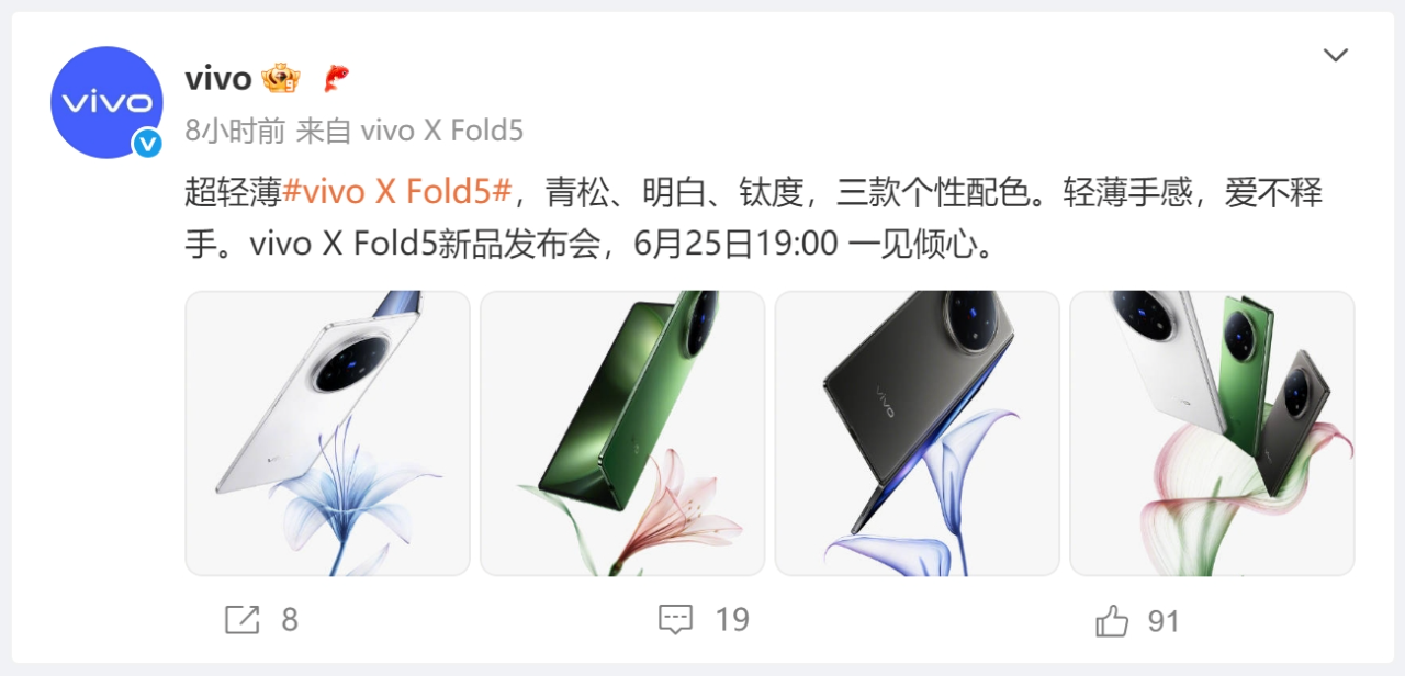 近日,vivo 官方正式宣布,将于 6 月 25 日 19:00 举办 vivo X Fold5 新品发布会。