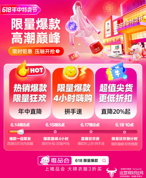 特卖电商唯品会消息,其618年中特卖节最后一波高潮将于6月15日晚8点启动。